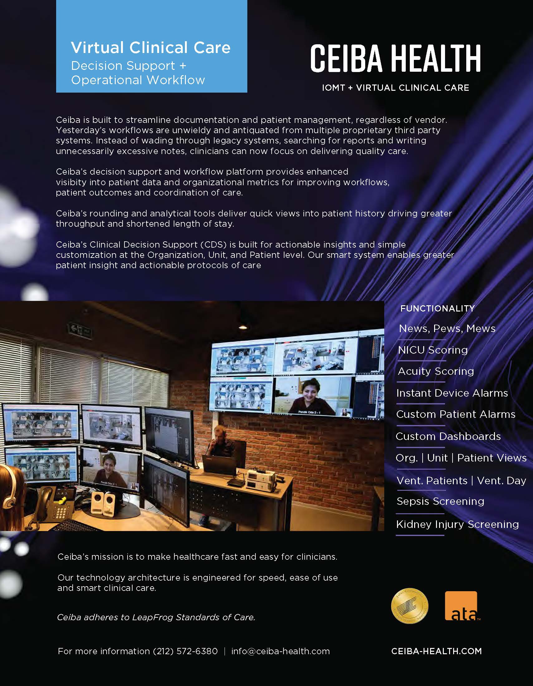 Ceiba's Enterprise Suite delivers connectivity and Interoperability, Continuous Monitoring, Decision Support, Workflow and Acute Virtual Care.